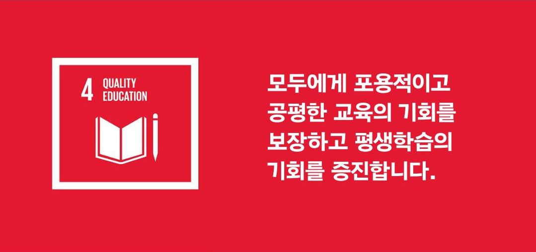 지속가능발전목표 4(SDG 4)는 교육에 관한 목표입니다. 모두에게 포용적이고 공평한 교육의 기회를 보장하고 평생학습의 기회를 증진하는 것을 목표로 합니다. 교육은 모두에게 다양한 목표를 성취할 수 있는 기회를 제공합니다. 아울러 교육은 성장으로 나아가는 길, 공중 보건을 증진하는 수단, 평화를 달성하는 디딤돌이 될 수도 있습니다.
